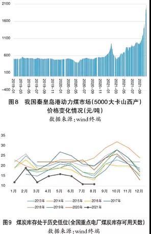 今年全球大宗商品價格暴漲,加之國內用能需求猛增,地方政府能耗雙控壓力較大,煤炭供應不足,煤價快速上漲,9月動力煤期貨現(xiàn)貨都推升至1400元/噸以上,10月企業(yè)動力煤現(xiàn)貨快速突破歷史極值,多地突破了2000元/噸。因為煤炭價格地區(qū)差異較大,各地燃煤上網電價也與煤炭資源稟賦和運輸成本關系較大。就東部沿海省份而言,煤電上網基準價在0.4~0.45元/千瓦時之間,當前平均不含稅上網電價為0.36元/千瓦時。從成本考慮,綜合考慮折舊0.05元/千瓦時,人工及運維0.05元/千瓦時,財務費用0.02元/千瓦時,管理費用0.01元/千瓦時,測算燃料成本、煤炭價格與企業(yè)盈虧的關系:一是如果燃料成本超過0.26元/千瓦時(含稅),對應5500大卡動力煤入爐價格680元/噸,預計多數(shù)企業(yè)將僅能夠維持盈虧平衡。二是如果燃料成本超過0.33元/千瓦時(含稅),對應5500大卡動力煤入爐價格864元/噸,預計多數(shù)企業(yè)將出現(xiàn)虧損現(xiàn)金成本,企業(yè)將沒有動力從事電力生產,在我國電網強制性考核機制下,一些電廠被迫報非停避免損失或者因為沒錢買煤而停產。此外,我國電力現(xiàn)貨仍處于試點階段,煤電企業(yè)主要簽訂的年度、月度售電合同,電價無法隨著煤價的快速變化而調整,電價往下游傳導有限(見圖8、圖9)。
