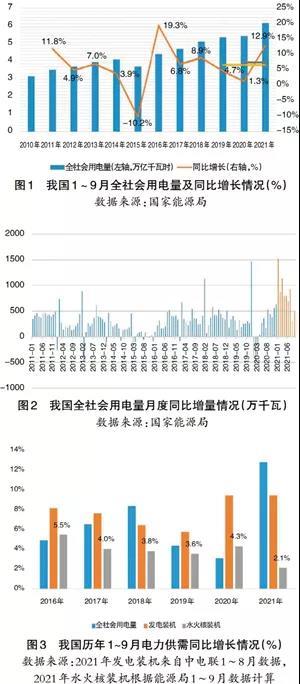 1~9月全社會用電量累計61651億千瓦時,同比增長12.9%,比2020年提高了11.6個百分點。鑒于2020年受疫情影響,2020~2021年兩年年均增速7.4%,2019~2021年三年年均增速6.5%,基本上與2017年(6.8%)、2018年(8.9%)持平,但疫情導致近兩年用電負荷波動較大。從增量看,2021年1~7月每個月同比增量均較多,創(chuàng)下近幾年新高。8~9月有所緩和,主要受三季度大規(guī)模拉閘限電影響。電力需求增長過快導致供給增長相對不足,2021年1~8月我國電源裝機同比增長9.5%,但是火電、核電、水電等穩(wěn)定供應電源裝機同比增長2.1%,低于近幾年數(shù)據(jù),在風光出力受阻情況下,電力保障存在較大壓力(見圖1、圖2、圖3)。