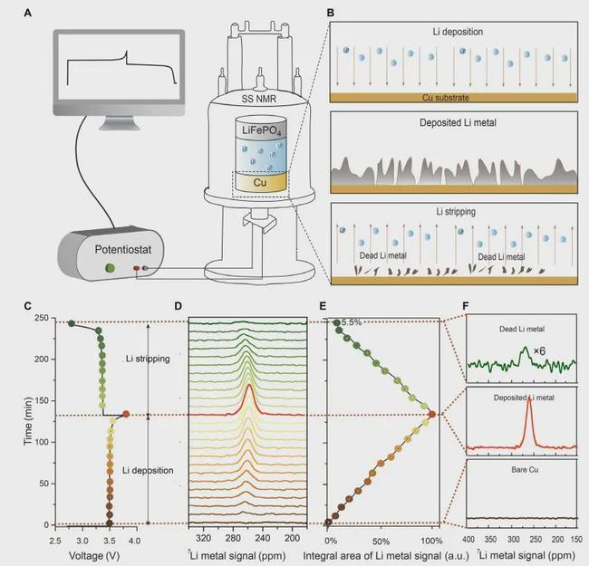 針對(duì)這一問題,楊勇教授課題組利用自建的電化學(xué)原位固體核磁共振裝置,原位觀察鋰金屬的動(dòng)態(tài)沉積/溶解過程,并通過定量的7Li核磁共振譜學(xué)技術(shù)量化循環(huán)過程形成的各種非活性鋰,探討了NMR定量技術(shù)、滴定氣相色譜技術(shù) (TGC) 以及質(zhì)譜滴定技術(shù)(MST)在分析“死鋰”組份產(chǎn)生差異的原因來自氫化鋰(LiH)。通過更為可靠的NMR定量方法,研究了鋰金屬電池在典型的電流密度、電解液添加劑和鋰鹽濃度條件下的失效機(jī)制。通過這些定量,揭示了鋰金屬電池的兩階段失效過程,并提出了抑制非活性鋰形成的策略。