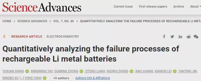 中國儲(chǔ)能網(wǎng)訊:近日,廈門大學(xué)化學(xué)化工學(xué)院楊勇教授課題組在鋰金屬電池失效機(jī)制的定量研究上取得重要進(jìn)展,成果以“Quantitatively analyzing the failure processes of rechargeable Li metal batteries”為題,在線發(fā)表于《科學(xué)進(jìn)展》(Science Advances doi:10.1126/sciadv.abj3423)。