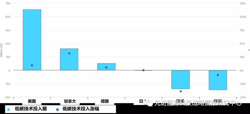大多數(shù)國(guó)家在2020年增加了對(duì)低碳技術(shù)的研發(fā)投入,但漲幅低于2018年。其中增量最大的是美國(guó),低碳能源技術(shù)RD&D公共投入增加6.77億美元,同比增長(zhǎng)9%(圖7)。其次是加拿大,增加了2.42億美元,但其增幅最大,同比增長(zhǎng)了31.4%。