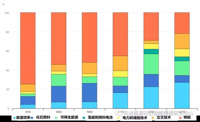 圖4 1974-2020年IEA成員國(guó)能源技術(shù)RD&D公共投入各領(lǐng)域占比(單位:%)