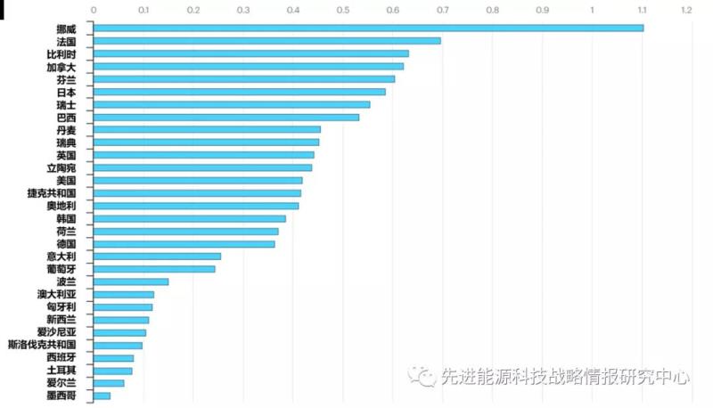 圖3 2020年按國(guó)家劃分單位GDP能源技術(shù)RD&D公共投入強(qiáng)度情況(單位:能源技術(shù)RD&D公共投入額/1000單位GDP)