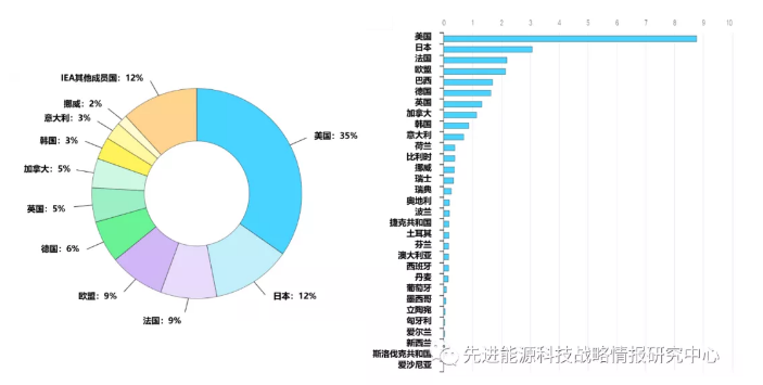 圖2 2020年IEA成員國(guó)和歐盟能源技術(shù)RD&D公共投入額及占比(左圖單位:%;右圖單位:以2020年購(gòu)買力平價(jià)計(jì)算的百萬美元)