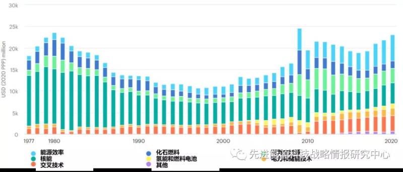 圖1 1977-2020年IEA成員國(guó)能源技術(shù)RD&D公共投入總額(單位:以2020年購(gòu)買力平價(jià)計(jì)算的百萬美元)