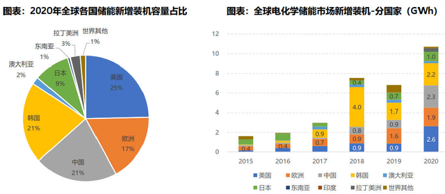 分國(guó)家來(lái)看,2020年新增電化學(xué)儲(chǔ)能裝機(jī)中國(guó)(新增1.2GW/2.3GWh,同比+168%)躍居首位,歐洲(新增1.2GW/1.9GWh,同比+19%)、美國(guó)(新增1.1GW/2.6GWh,同比+207%)分列全球第二、第三,合計(jì)裝機(jī)達(dá)3.5GW/6.8GWh,同比+107%,占全球新增的63%。另外,韓國(guó)新增0.85GW/2.24GWh,同比+30%,日本新增0.55GW/0.98GWh,同比+36%,居全球第四、第五。