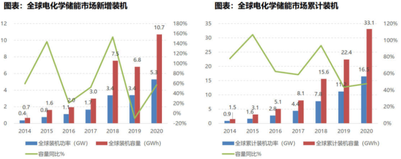全球電化學(xué)儲(chǔ)能裝機(jī)持續(xù)增長(zhǎng),累計(jì)達(dá)16.5GW/33.1GWh:2020年全球新增電化學(xué)儲(chǔ)能5.3GW/10.7GWh,同比+57%,主要得益于中國(guó)(新增1.2GW/2.3GWh,同比+168%)和美國(guó)(新增1.1GW/2.6GWh,同比+207%)儲(chǔ)能市場(chǎng)的迸發(fā)。截至2020年底全球已投運(yùn)電化學(xué)儲(chǔ)能累計(jì)裝機(jī)16.5GW/33.1GWh,同比+57%,占光伏累計(jì)裝機(jī)的2.3%。