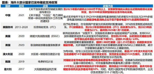 2)政策:海外政策支持可再生能源發(fā)電是儲(chǔ)能發(fā)展的底層邏輯,同時(shí)通過(guò)補(bǔ)貼、允許儲(chǔ)能參與電力市場(chǎng)交易等激發(fā)配儲(chǔ)需求;