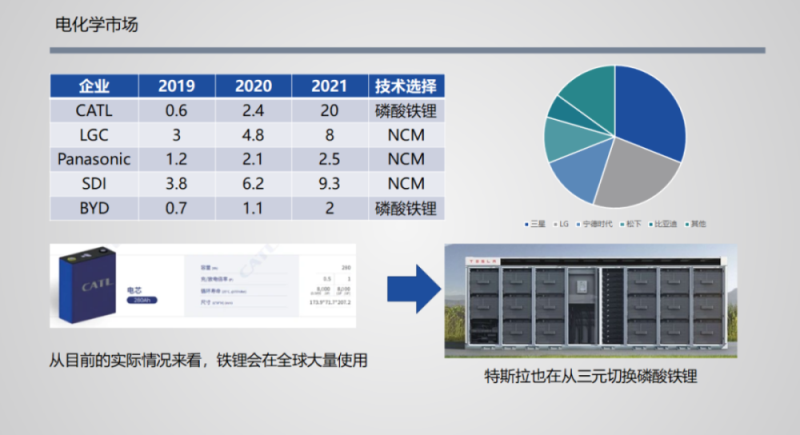 各家在鋰電池的技術(shù)路線上也分為兩派,寧德時(shí)代和比亞迪堅(jiān)定地走磷酸鐵鋰路線,而其余三家均在走三元鋰路線,特斯拉則從三元鋰切換成磷酸鐵鋰。這或與各家自身優(yōu)勢和對電儲(chǔ)能市場判斷及投入力度有關(guān)。