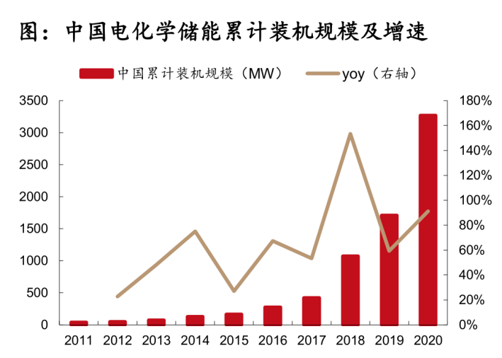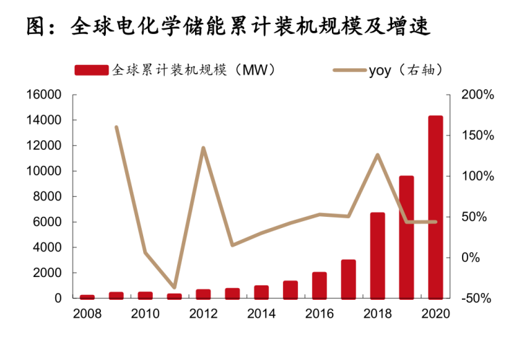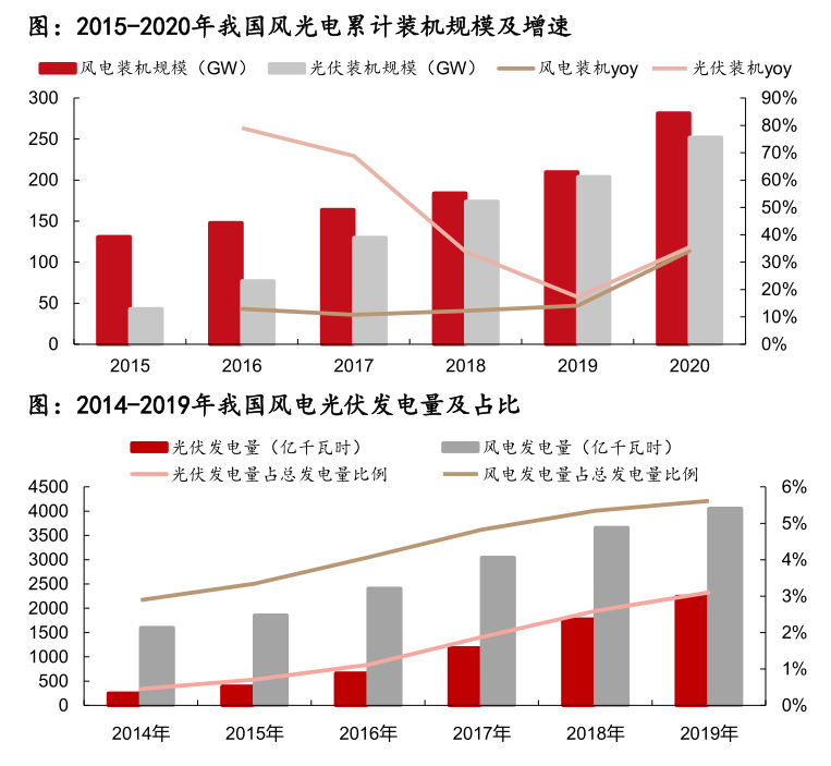 連鎖反應(yīng)之一就是,火電的替代品風(fēng)電和光伏的比重越來越高。我國2020年風(fēng)電和光伏累計(jì)裝機(jī)量已經(jīng)由2015年的131/43GW增至282/252GW,累計(jì)占比已經(jīng)超過20%,隨著風(fēng)電和光伏成本的持續(xù)下降,其占比依然在提升。而前文提到,風(fēng)電和光伏電的消納問題嚴(yán)重,為了減少浪費(fèi)和避免對電網(wǎng)的沖擊,風(fēng)電和光伏電需要電儲(chǔ)能的配套,這樣才有利于滿足電網(wǎng)規(guī)定獲取并網(wǎng)資格。