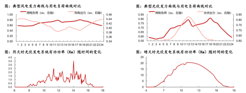 比如大的周期方面風(fēng)電受到季節(jié)性風(fēng)力波動(dòng)影響,短的周期如每日不同時(shí)間段風(fēng)力差異也很大,通常出力高峰在凌晨左右,而正午則為低谷,因此波動(dòng)幅度最高可達(dá)80%。光伏發(fā)電日內(nèi)波動(dòng)100%,很明顯夜間光伏發(fā)電完全不出力,而白天的陰晴變化也大幅影響光伏發(fā)電的功率。