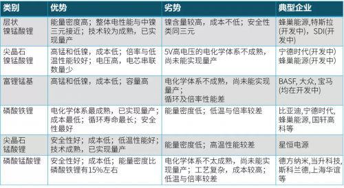 落地到電池企業(yè)的生產(chǎn)上,對(duì)“鈷”有強(qiáng)感知的是上游材料價(jià)格。 近幾年中國鈷的產(chǎn)量隨著開采而逐漸枯竭,進(jìn)口的比例逐年增加,使得電池企業(yè)得到“鈷”的成本越來越高。 “鈷”價(jià)居高不下,與動(dòng)力電池企業(yè)降本的大方向背道而馳。以50kWh的A級(jí)車來計(jì)算,如果按NCM523體系,一輛車大約需要11公斤鈷,如果按年銷2000萬輛計(jì)算的話,需要22萬噸鈷;換成高鎳811體系的話就只需要一半,必須先“少鈷”,然后“無鈷”。無鈷電池家族或者叫做廣義的無鈷正極材料大致包括:層狀無鈷、尖晶石鎳錳酸鋰、富鋰錳基、磷酸鐵鋰、磷酸錳酸鋰、錳酸鋰等,今后我們統(tǒng)稱“泛無鈷家族”,如下表:
