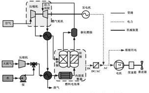 圖2 高溫燃料電池與燃?xì)廨啓C(jī)構(gòu)成混合動(dòng)力系統(tǒng)[1]