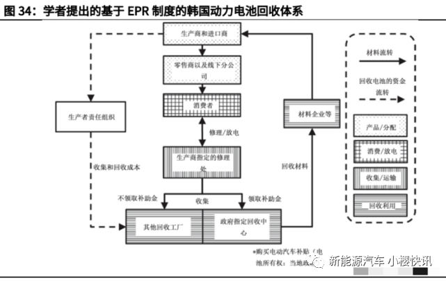 有鑒于此,有韓國學(xué)者也提出基于 EPR 制度的適用于韓國可行的動力電池回收 體系,在該回收體系中,電池生產(chǎn)者成立生產(chǎn)者責(zé)任組織以統(tǒng)籌安排回收動力電 池的相關(guān)費(fèi)用,并且政府通過補(bǔ)助金形式促進(jìn)消費(fèi)者將電池轉(zhuǎn)交給政府指定回收中心,材料企業(yè)通過拆解回收獲得金屬并流轉(zhuǎn)回生產(chǎn)商或進(jìn)口商,從而形成電池回收的良好循環(huán)。值得注意的是,在韓國的動力電池回收體系建立中,也有中國公司的身影,例如,格林美在 2019 年 10 月與韓國浦項(xiàng)市政府、ECOPRO,就 新能源汽車電池梯次利用及循環(huán)再生項(xiàng)目推進(jìn),簽署諒解備忘錄。