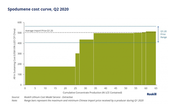 據(jù)鋰資源研究機構(gòu)Roskill官網(wǎng),2020年二季度全球鋰輝石(6%鋰精礦)成本曲線在200美元/噸至500美元/噸左右的區(qū)間。