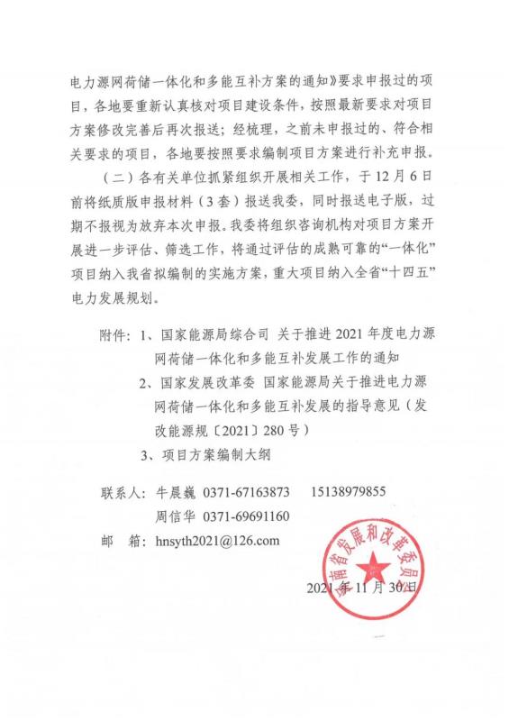 中國儲能網(wǎng)訊:11月30日,河南省發(fā)改委發(fā)布了《關(guān)于補充申報“十四五”電力源網(wǎng)荷儲一體化和多能互補項目方案》的通知。按照“先行先試、逐步推廣”的原則,在今年上半年河南發(fā)改委組織申報項目的基礎(chǔ)上,再次補充申報“一體化”項目。