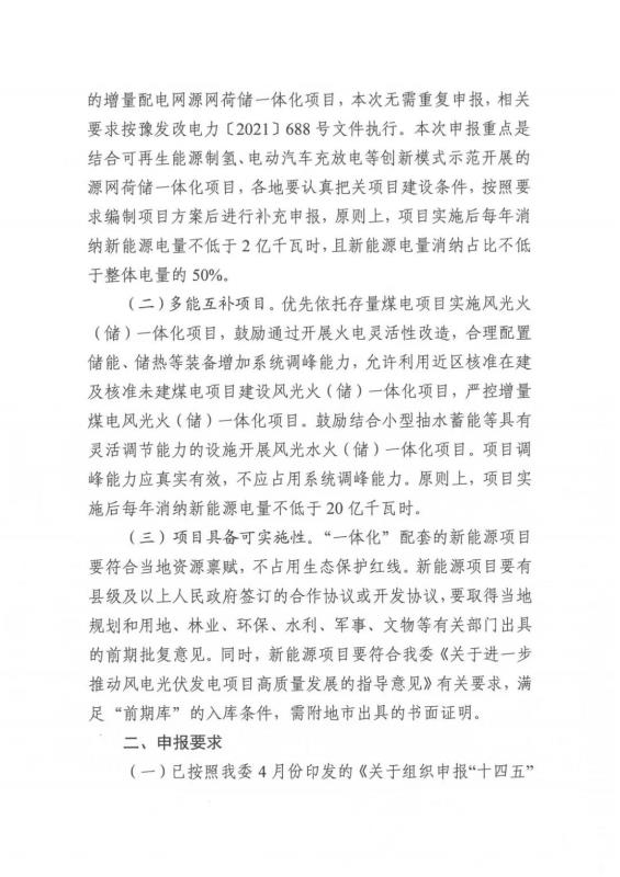 對于源網(wǎng)荷儲一體化項目,本次補充申報重點結(jié)合可再生能源制氫、電動汽車充放電等創(chuàng)新模式示范開展的源網(wǎng)荷儲一體化項目,各地要認(rèn)真把關(guān)項目建設(shè)條件,按照要求編制項目方案后進行補充申報,原則上,項目實施后每年消納新能源電量不低于2億千瓦時,且新能源電量消納占比不低于整體電量的50%。