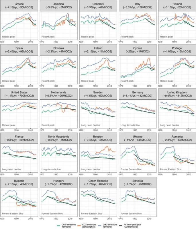 研究表明,24個領先者分為三組:6個早在20世紀70年代就達到峰值的早期起步者,6個在20世紀90年代迅速減少排放量并從那時起一直在下降的前東方集團國家,12個晚起步者僅在21世紀初達到峰值。烏克蘭(自1988年以來下降了77%)、丹麥(自1996年以來下降56%)、英國(自1973年以來下降了46%)、德國(自1979年以來下降了37%)和美國(自2005年以來下降了12%)是自達峰以來減排幅度較大的國家。在發(fā)展中國家中只有牙買加,這主要是由于其全球重要的鋁土礦采礦部門的燃料節(jié)約。