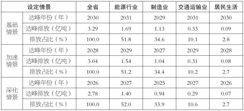 ◆在基礎情景下,全省與全國同步達峰,但能源行業(yè)、交通運輸業(yè)要比全國晚1年達峰,制造業(yè)早1年達峰;