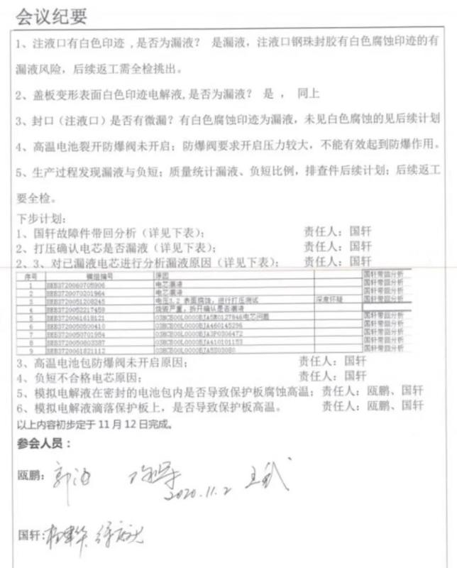 ▲會(huì)議紀(jì)要顯示國軒高科電芯存在漏液、防爆閥未開啟等問題 圖源:甌鵬動(dòng)力