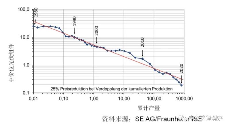 光伏組件價格不斷地下降,數(shù)量每翻一番價格就會下降25%(圖二),超過了德國價格控制模型中對光伏價格的預(yù)估。結(jié)果價格控制模型果然出了典型的風(fēng)險問題,即光伏發(fā)電補(bǔ)貼的數(shù)量失控。2009年以后,由于光伏發(fā)電補(bǔ)貼過多,造成電價迅速上漲(圖一中紅色曲線的第一次上升部分)。德國政府 2012年修改了價格控制模型中光伏價格的模型,降低了對光伏的補(bǔ)貼(圖一中紅色曲線的第一次平緩部分)。針對可再生能源的波動性引起的電力系統(tǒng)平衡能量逐漸地增多,德國政府又對可再生能源上市實(shí)行了義務(wù)制和獎勵制,發(fā)揮了具有自平衡機(jī)制的電力市場的作用,減低了對電力系統(tǒng)平衡能量的需求[3],但是能源密集型產(chǎn)業(yè)的免稅使分?jǐn)偟狡渌I(yè)和居民的電費(fèi)成倍上漲(圖一中紅色曲線的第二次上升部分)。當(dāng)時德國政府的定價原則是補(bǔ)貼應(yīng)高于現(xiàn)貨市場價格。由于可再生能源越來越多,現(xiàn)貨市場價格下降得越厲害,所以大多數(shù)可再生能源的持有者還是選擇繼續(xù)拿補(bǔ)貼。雖然平衡市場有了一直激勵的機(jī)制,但現(xiàn)貨市場仍然沒有什么起色,也沒有解決電價居高不下的困局。德國政府2014年不得不又重新修訂可再生能源法,要求自備電廠也必須繳納可再生能源能源“稅”(能源密集型產(chǎn)業(yè)除外),限制不合理的“避稅”的情況。
