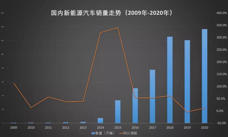 國(guó)內(nèi)新能源汽車(chē)銷(xiāo)量趨勢(shì)(2009年-2020年)
