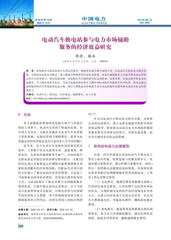 李捷, 楊冰. 電動(dòng)汽車換電站參與電力市場(chǎng)輔助服務(wù)的經(jīng)濟(jì)效益研究[J]. 中國(guó)電力, 2020, 53(12): 258-262, 269.
