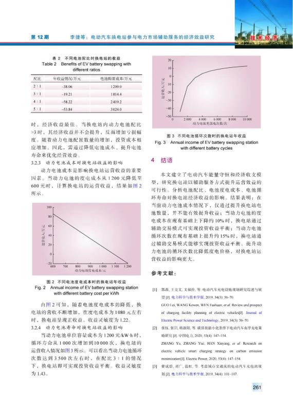 結(jié)論:本文建立了電動(dòng)汽車能量守恒和經(jīng)濟(jì)收支模型,研究換電站以輔助服務(wù)方式提升運(yùn)營(yíng)效益的可行性。分析電池配比、電池度電成本、電池循環(huán)壽命對(duì)換電站經(jīng)濟(jì)收益的影響。結(jié)果表明:在當(dāng)前動(dòng)力電池成本情況下,僅通過提升換電站電池?cái)?shù)量,并不能有效提升收益;當(dāng)動(dòng)力電池的度電成本在現(xiàn)有基礎(chǔ)上下降約10%時(shí),換電站通過輔助交易模式可實(shí)現(xiàn)投資收益平衡;當(dāng)動(dòng)力電池循環(huán)次數(shù)在現(xiàn)有基礎(chǔ)上提升約15%時(shí),換電站通過輔助交易模式能夠?qū)崿F(xiàn)投資收益平衡。提升動(dòng)力電池的循環(huán)次數(shù)比降低度電價(jià)格,對(duì)換電站運(yùn)營(yíng)收益的影響更大。