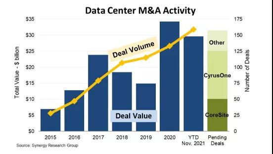 據(jù)Synergy研究統(tǒng)計(jì),截至2021年11月中旬,今年已完成的數(shù)據(jù)中心并購(gòu)交易總數(shù)已遠(yuǎn)遠(yuǎn)超過去年的創(chuàng)紀(jì)錄數(shù)量。雖然今年迄今為止完成的交易總價(jià)值尚未達(dá)到2020年的水平,但如果CoreSite的收購(gòu)在年底前正式完成,2021年的交易價(jià)值至少比去年高出16%。而且由于還有幾項(xiàng)交易已達(dá)成一致但正在等待正式結(jié)束,因此2021年的最終數(shù)字可能會(huì)更高。