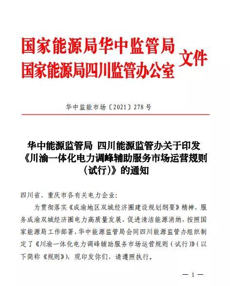 據(jù)此,華中能源監(jiān)管局積極落實(shí)中央和國(guó)家能源局決策部署,結(jié)合川渝電力一體化發(fā)展新形勢(shì),會(huì)同四川能源監(jiān)管辦組織川渝地區(qū)相關(guān)電力企業(yè)及時(shí)制訂了《川渝一體化電力調(diào)峰輔助服務(wù)市場(chǎng)運(yùn)營(yíng)規(guī)則(試行)》。