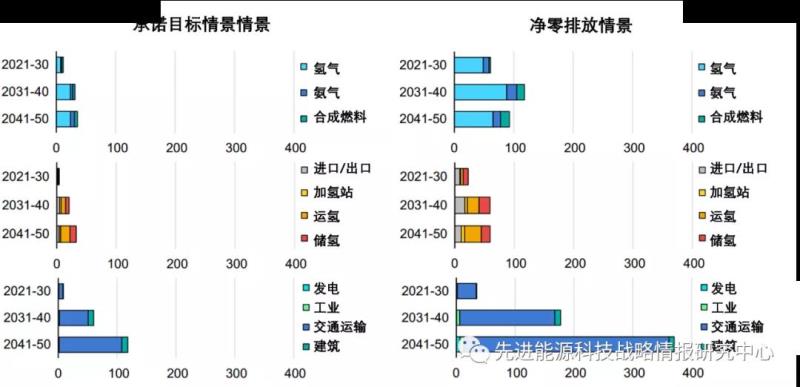 圖3 承諾目標(biāo)情景和凈零排放情景中各領(lǐng)域氫能相關(guān)技術(shù)投資額需求(單位:十億美元)