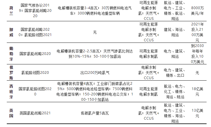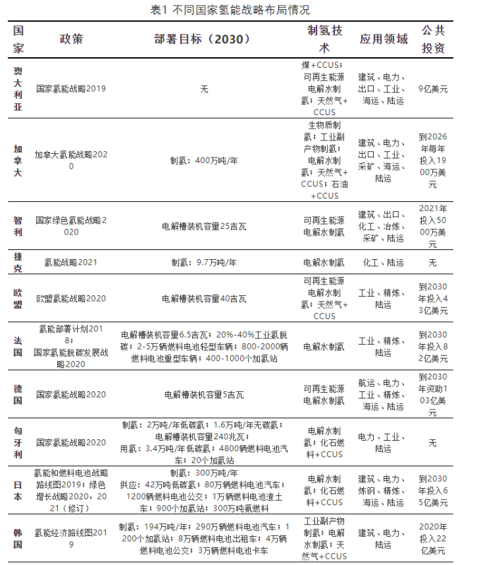 迄今公布的氫能戰(zhàn)略顯示,幾乎所有國(guó)家對(duì)氫能在其能源系統(tǒng)中所扮演角色的認(rèn)識(shí)大致相同,都強(qiáng)調(diào)了其對(duì)交通運(yùn)輸和工業(yè)部門脫碳的重要性。具體國(guó)家氫能戰(zhàn)略布局如表1所示: