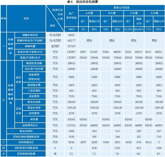 在項目投資內部收益率(稅前)9%滿足調峰補貼電價收益的基礎上,比較“電廠自行投資”和采用合同能源管理經(jīng)營模式由“服務公司投資”建設運營兩種方式,考慮A、B、C、D四個分成方案,項目經(jīng)濟性測算見表4。