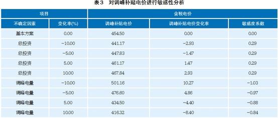 敏感性分析。當項目投資內部收益率(稅前)9%時,影響項目經(jīng)濟性較敏感因素——總投資、調峰電量變化±5%、±10%情況下對調峰補貼電價進行敏感性分析。