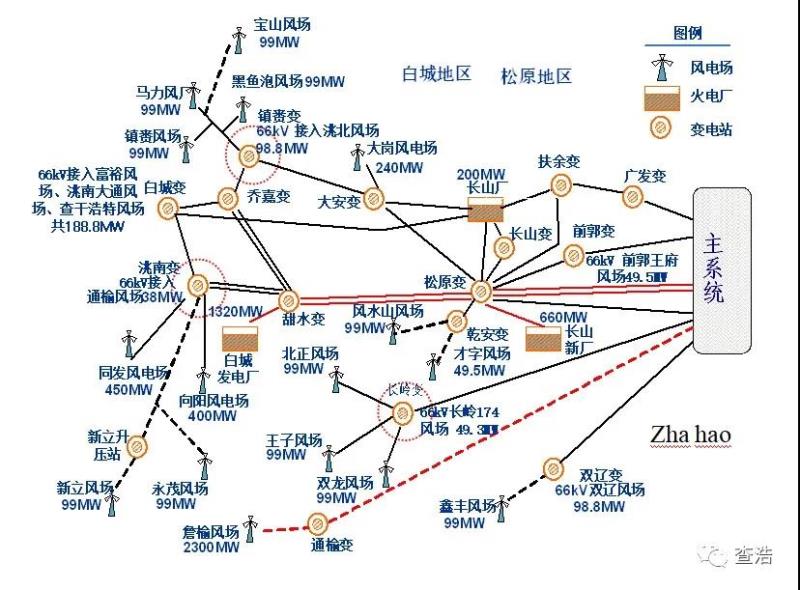 下面兩張圖是早期的新能源場(chǎng)站接入電網(wǎng)的示意圖,大體可以看出,早期投運(yùn)的新能源電站大多位于電網(wǎng)末端,開(kāi)發(fā)相對(duì)集中,往往是多個(gè)電站連片匯集接入到電網(wǎng)。