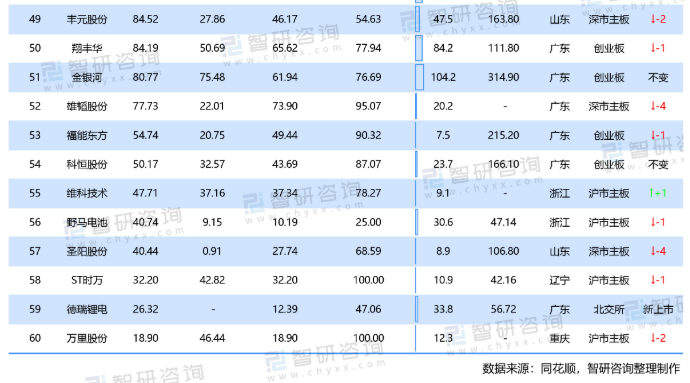 從所屬省份看,60家企業(yè)分布在17個(gè)省份,總部位于廣東的企業(yè)最多,有25家,占比高達(dá)41.67%,其中有億緯鋰能、天賜材料、欣旺達(dá)、貝特瑞4家企業(yè)總市值排名進(jìn)入前10強(qiáng),7家企業(yè)坐落于浙江,其中總市值最高的是排名第12的杉杉股份;從上市板塊來(lái)看,21家企業(yè)在滬深主板上市,20家企業(yè)在創(chuàng)業(yè)板上市,16家企業(yè)在科創(chuàng)板上市,以及上月3家企業(yè)在北交所上市。