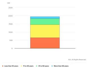 圖1 按在運電廠服役壽命劃分的全球剩余煤炭產(chǎn)能分布(2021年)
