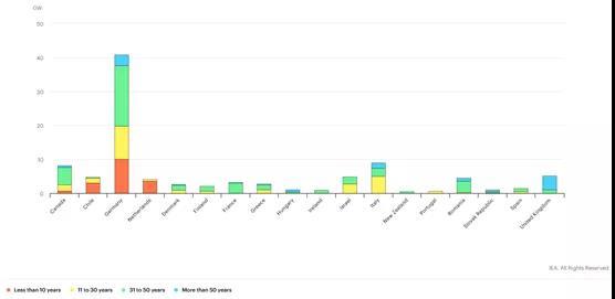 圖二 部分國家按在運電廠服役壽命劃分的剩余煤炭產(chǎn)能分布(2021)