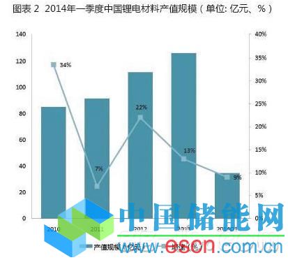 中國(guó)儲(chǔ)能網(wǎng)訊:2014年第一季度鋰電材料產(chǎn)值規(guī)模達(dá)34.7億元,同比增長(zhǎng)9%,其中正極材料、負(fù)極材料、電解液、隔膜分別為19億元、5.7億元、5.9億元和4.5億元。