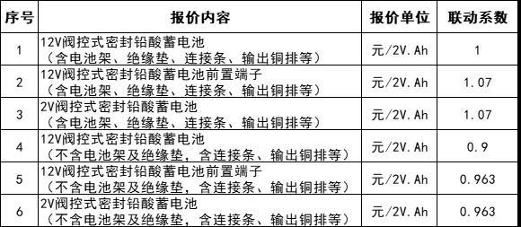基準(zhǔn)型號產(chǎn)品“12V閥控式密封鉛酸蓄電池(含電池架、絕緣墊、連接條、輸出銅排等)”最高投標(biāo)限價(jià)為0.885元人民幣/2V.Ah(不含稅), 非基準(zhǔn)型號產(chǎn)品單價(jià)根據(jù)基準(zhǔn)型號產(chǎn)品單價(jià)乘以價(jià)格聯(lián)動(dòng)系數(shù)后保留3位小數(shù)計(jì)算得出,價(jià)格聯(lián)動(dòng)系數(shù)見下表:
