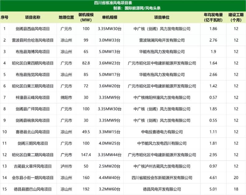 四川省核準(zhǔn)風(fēng)電項(xiàng)目如下: