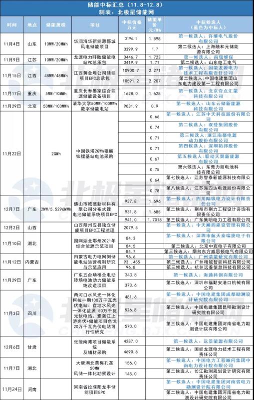 中國儲能網(wǎng)訊:11月初至今共有15個儲能相關項目發(fā)布候選人公示,其中有7個項目是儲能電池和儲能系統(tǒng)招標,儲能電池最高單價0.9元/Wh,儲能EPC最高單價2.271元/Wh,最低單價1.598元/Wh。