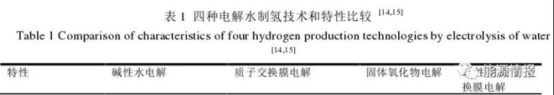 根據(jù)使用電解質(zhì)的不同,電解水的方式可分為堿性水電解(alkaline,ALK)、質(zhì)子交換膜電解(proton exchange membrane,PEM)、固體氧化物電解(solid oxide electrolysis cell,SOEC)、堿性陰離子交換膜電解(alkalineanionexchangemembrane,AEM)等4種,基本性能參數(shù)對(duì)比見表1。AEM目前還在初步探索中,SOEC由于環(huán)境的特殊性和公用工程條件的局限性,高溫水蒸氣電解制氫產(chǎn)業(yè)上難以實(shí)施;相對(duì)來說,堿性電解槽制氫、質(zhì)子交換膜電解制氫較方便實(shí)施。
