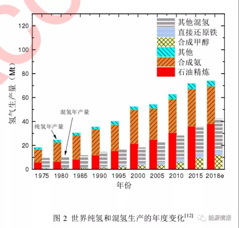 圖2是世界純氫和混氫生產(chǎn)的年度變化。純氫是經(jīng)過了分離和提純的氫氣,混氫則是含有一定量的伴生氣體,且未經(jīng)分離和提純。純氫生產(chǎn)主要用于石油化工、氨合成、燃料電池等混氫主要用于甲醇合成、直接還原鐵生產(chǎn)以及其他領(lǐng)域。2018年,全球純氫生產(chǎn)量為7400萬噸,混氫生產(chǎn)量為4200萬噸,合計(jì)11600萬噸。