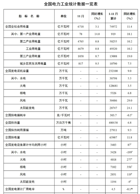 1-11月份,全國發(fā)電設(shè)備累計(jì)平均利用3483小時(shí),比上年同期增加87小時(shí)。其中,核電7102小時(shí),比上年同期增加356小時(shí);風(fēng)電2031小時(shí),比上年同期增加119小時(shí)。