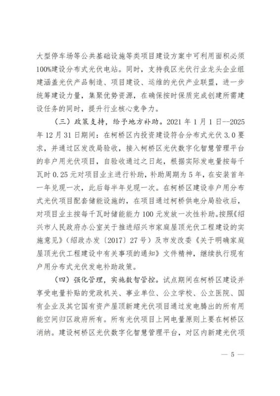 政策方面給予一定的地方補(bǔ)助,2021年1月1日--2025年12月31日期間:在柯橋區(qū)內(nèi)投資建設(shè)符合分布式光伏3.0要求,根據(jù)實(shí)際發(fā)電量按每千瓦時(shí)0.25元對項(xiàng)目業(yè)主進(jìn)行補(bǔ)助,補(bǔ)助周期為5年,在安裝首年一年兌現(xiàn)一次,此后每半年兌現(xiàn)一次。在柯橋區(qū)建設(shè)非戶用分布式光伏項(xiàng)目配套儲(chǔ)能設(shè)施的,在項(xiàng)目通過柯橋供電分局驗(yàn)收后,對項(xiàng)目業(yè)主按每千瓦時(shí)儲(chǔ)能能力100元發(fā)放一次性補(bǔ)助。