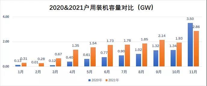 12月17日,國家能源局公布了2021年11月戶用光伏項目信息。截至2021年11月底,全國累計納入2021年國家財政補貼規(guī)模戶用光伏項目裝機容量為16.49 GW。2021年11月新納入國家財政補貼規(guī)模戶用光伏項目總裝機容量為2.86 GW,同比下降18.29%,環(huán)比增長48.19%。
