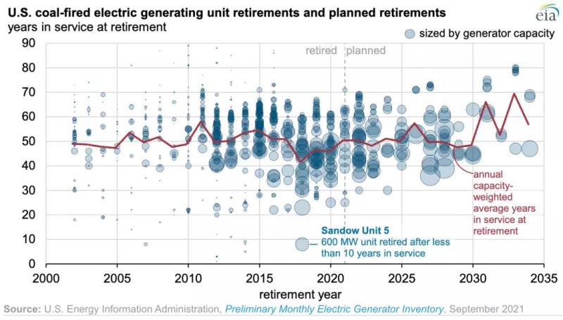 截至2021年9月,美國還有212吉瓦的公用事業(yè)規(guī)模燃煤發(fā)電廠在運(yùn)行,其中大部分是在20世紀(jì)70年代和80年代建成的。美國燃煤發(fā)電機(jī)組的平均運(yùn)行年限為45年。