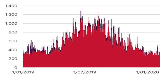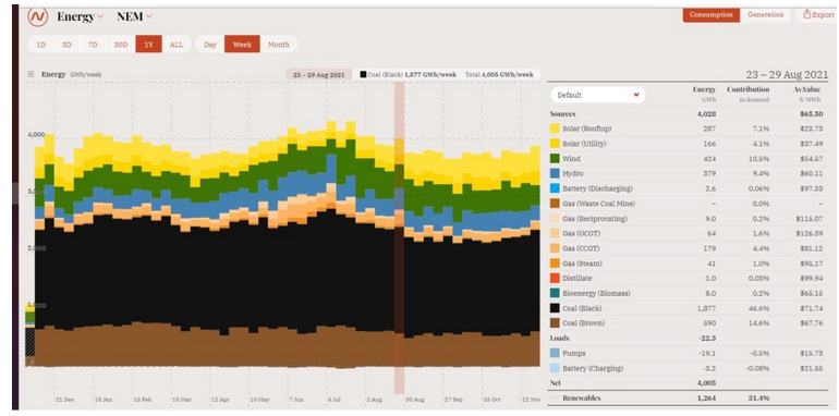 上圖是按發(fā)電類型劃分的澳大利亞國(guó)家電力市場(chǎng)(NEM)每周的能耗,顯示澳大利亞冬季太陽(yáng)能發(fā)電量較低,而天然氣發(fā)電和燃煤發(fā)電量顯著增加。如果短期管理和儲(chǔ)能系統(tǒng)應(yīng)對(duì)需求高峰,每周需求是一個(gè)有用的指標(biāo)。除昆士蘭州外,澳大利亞其他州的冬季每周電力需求都高于夏季。