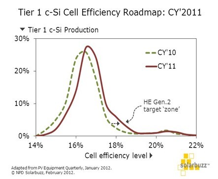 中國儲能網(wǎng)訊:根據(jù)最新出版的NPDSolarbuzz光伏設(shè)備季度報告指出,不斷提高光電轉(zhuǎn)換效率和組件額定功率已是當今光伏行業(yè)的關(guān)鍵指標。這不僅是整個行業(yè)的長期目標,而且是在競爭激烈的光伏產(chǎn)業(yè)環(huán)境下領(lǐng)軍廠商脫穎而出的必要條件。光電轉(zhuǎn)換效率的提高意味著制造工藝流程和原材料(主材和輔材)的改變,理想情況下,引領(lǐng)這些改變的各種技術(shù)構(gòu)成了一份技術(shù)路線圖。